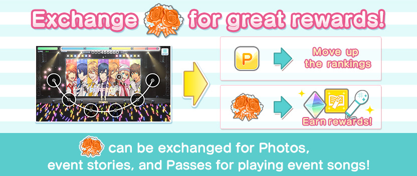 Collect Event Points and Collection Points by clearing songs. Earn Event Points to unlock items in the event Exchange that can then be traded for Collection Points. Event Points also count towards your event ranking.