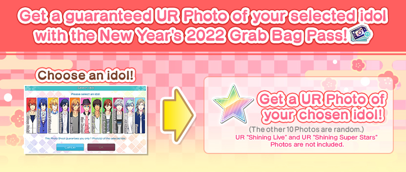 The New Year’s 2022 Grab Bag Pass contained in the New Year’s 2022 Grab Bag Pass Set allows you to use a special 11-Shot Photo Shoot that guarantees one UR Photo of your chosen idol!