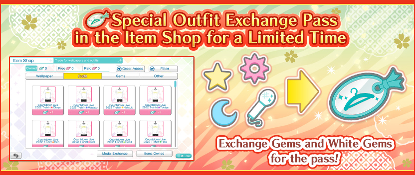 Exchange Small Gems and White Gem for Special Outfit Exchange Passes! Use the passes to get the shop-exclusive Live2D Outfit “Shining Countdown Live 2021-2022 T-shirt.”