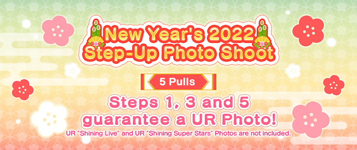 This 11-Shot Step-Up Photo Shoot is available five times per player and Steps 1, 3, and 5 each guarantee a UR Photo! Step 2 guarantees at least three SR or above Photos, and Step 4 guarantees at least five SR or above Photos! The New Year’s 2022 Step-Up Photo Shoot also includes the following Photos!
