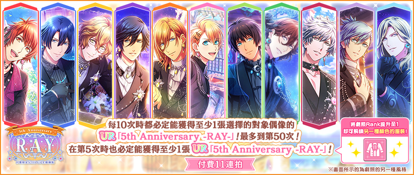 此外,除了當抽中UR時有50%的機率會是UR「5th Anniversary -RAY-」系列劇照外,